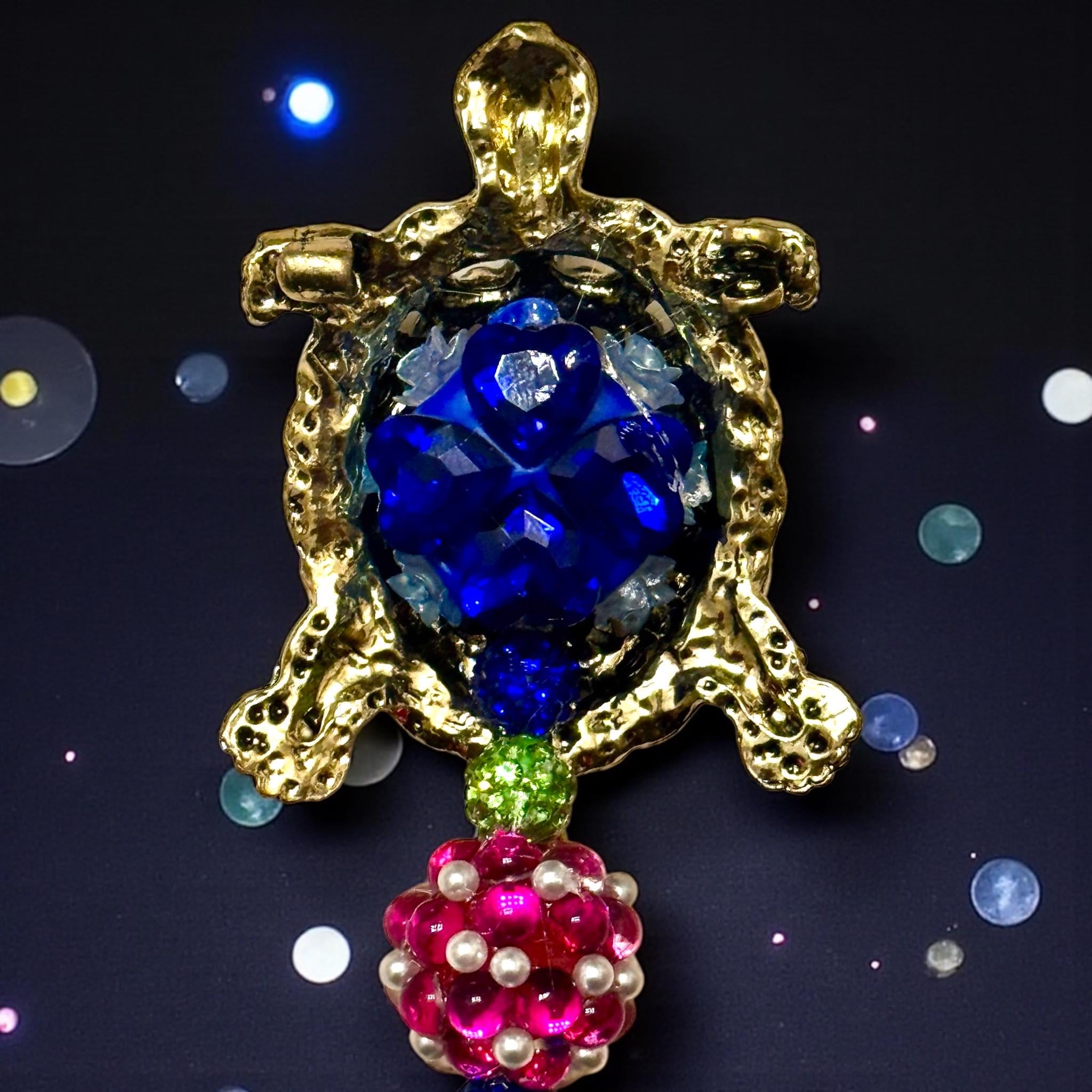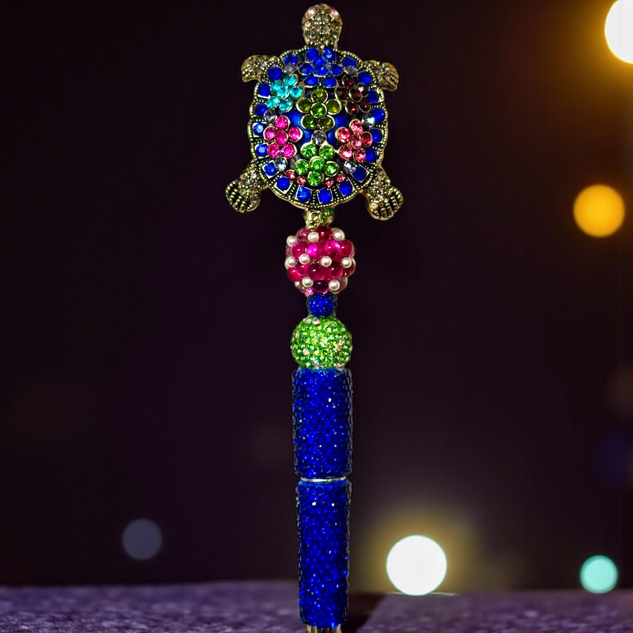 Indulge in the captivating allure of the Blue Rhinestone Turtle Pen, a masterpiece of elegance and charm ready to transform your writing experience. This dazzling pen is adorned with intricately placed rhinestones sparkling in a variety of vibrant hues, including rich blues, radiant pinks, lush greens, and luxurious gold. The turtle design serves not just as a motif, but as a statement piece that adds a touch of whimsy and elegance to your desk or collection.