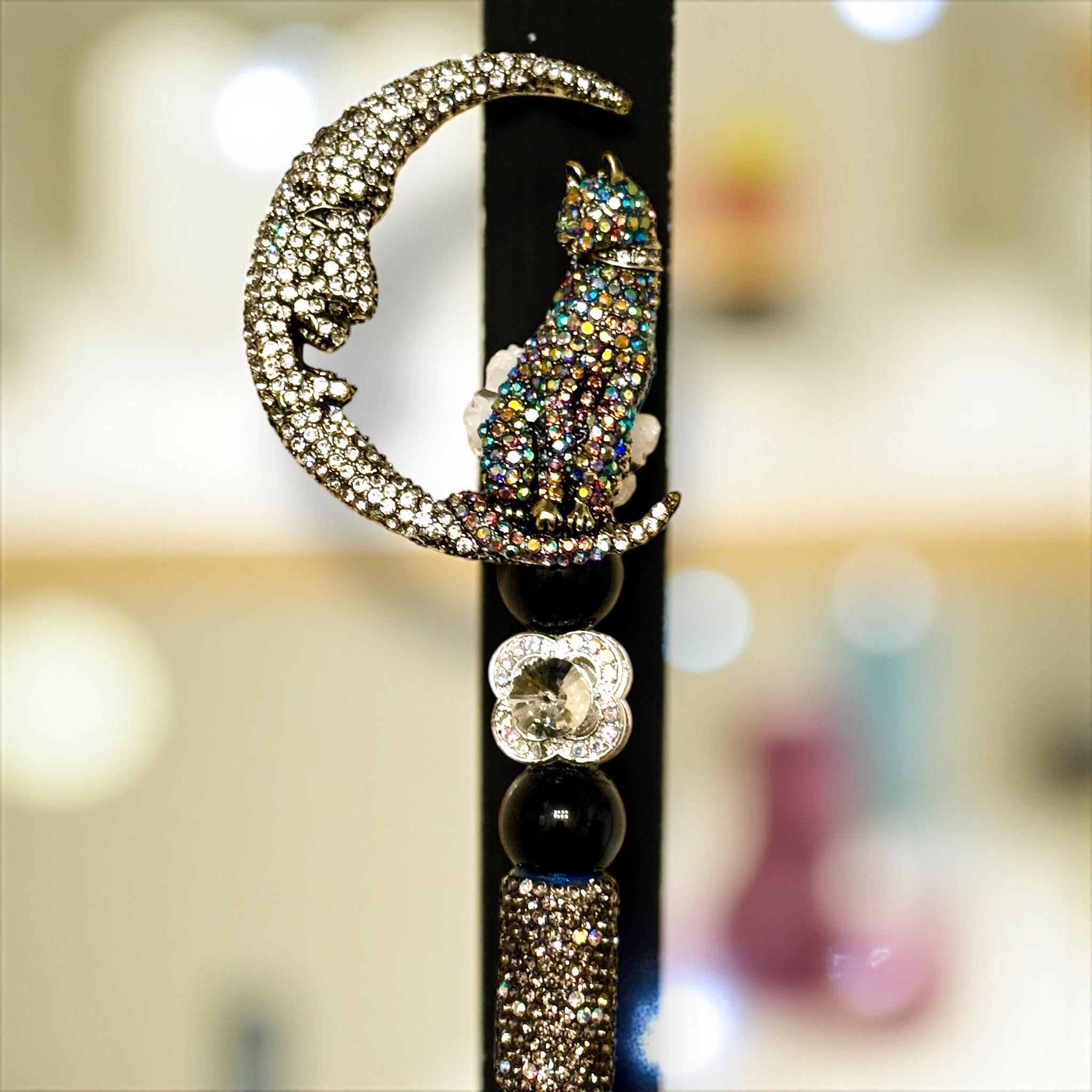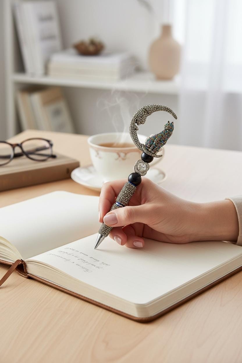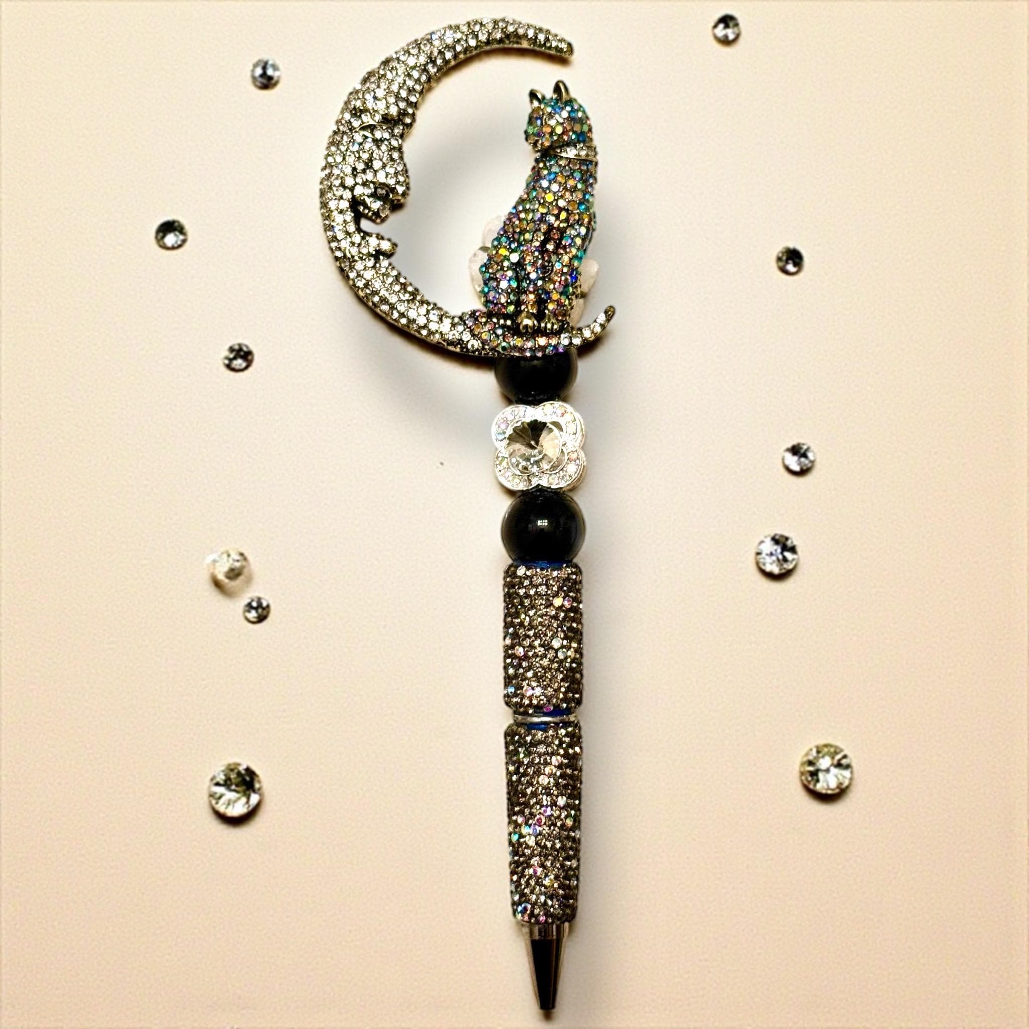Exquisite Craftsmanship: Adorned with sparkling rhinestones, the pen captures the enchanting silhouette of a kitty sitting gracefully on a crescent moon.