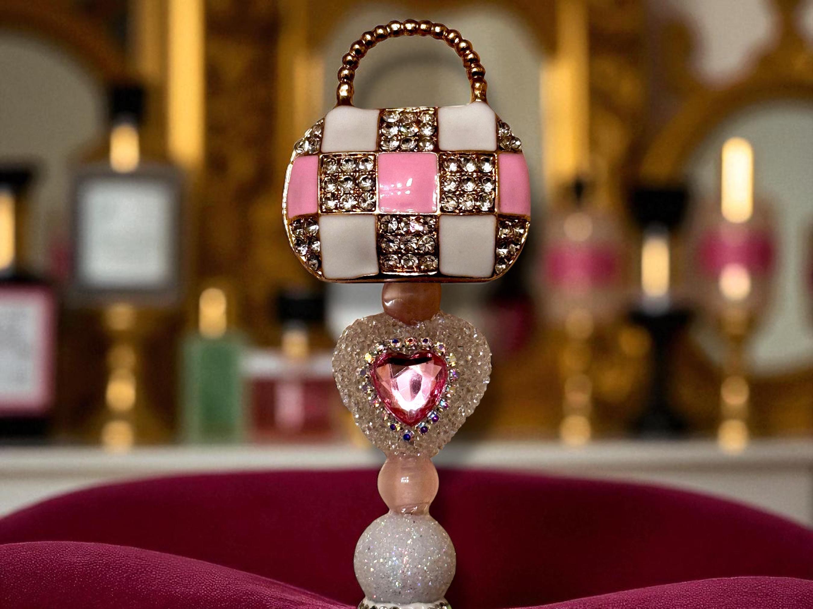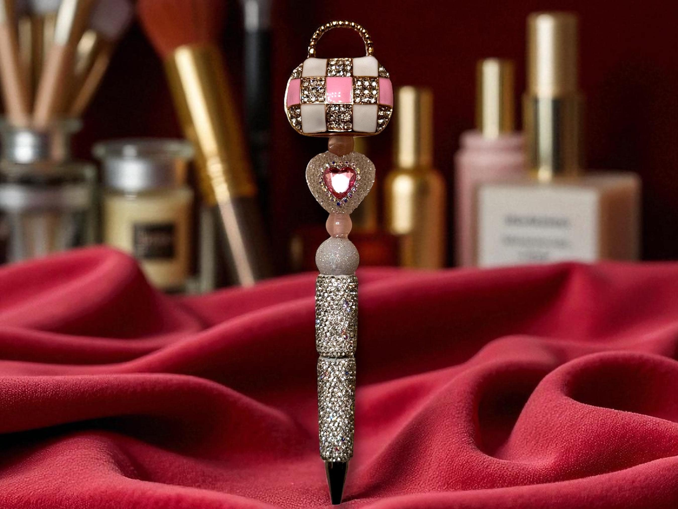 Transform your scribbles into sparkles with the Pink and White Enamel Rhinestone Purse Pen!