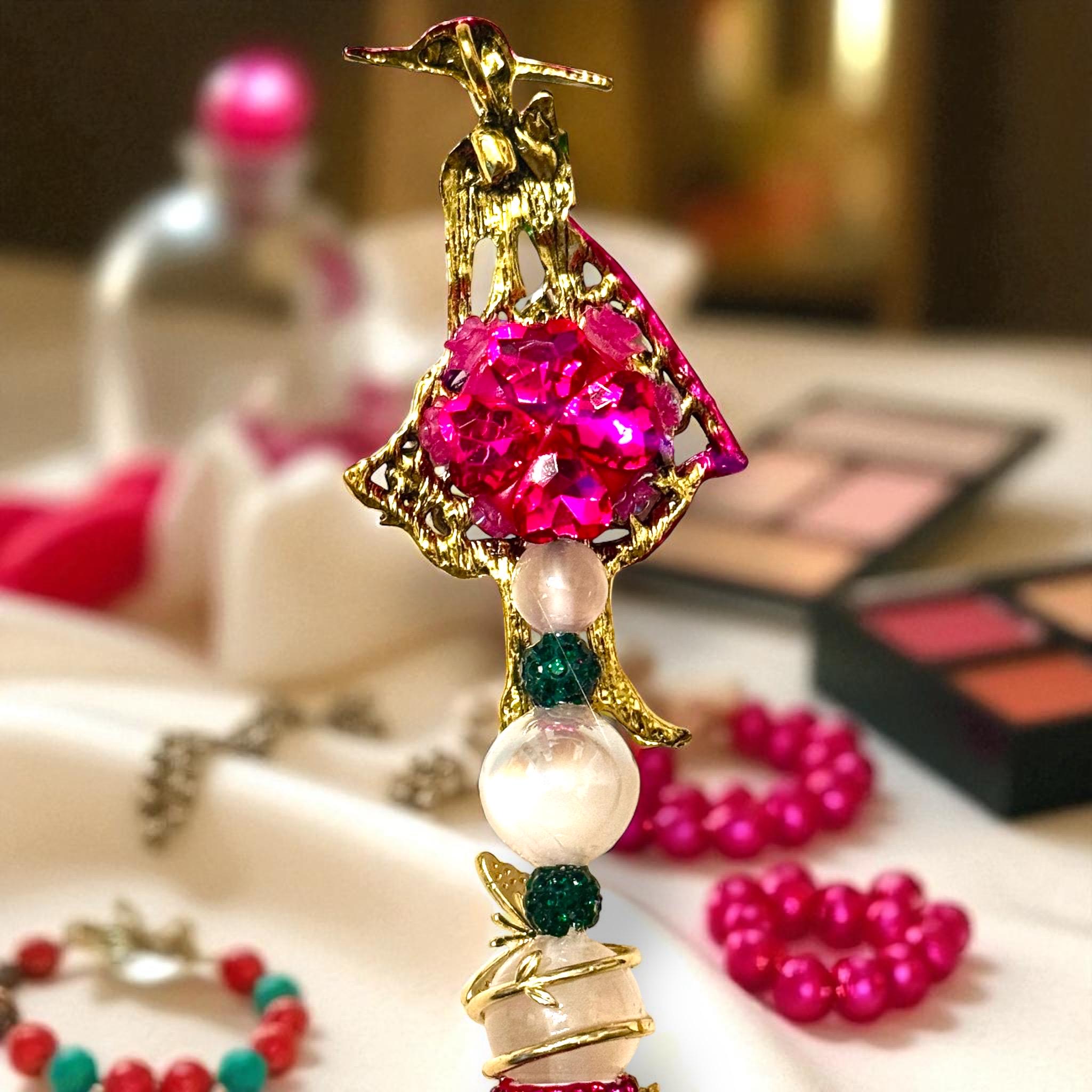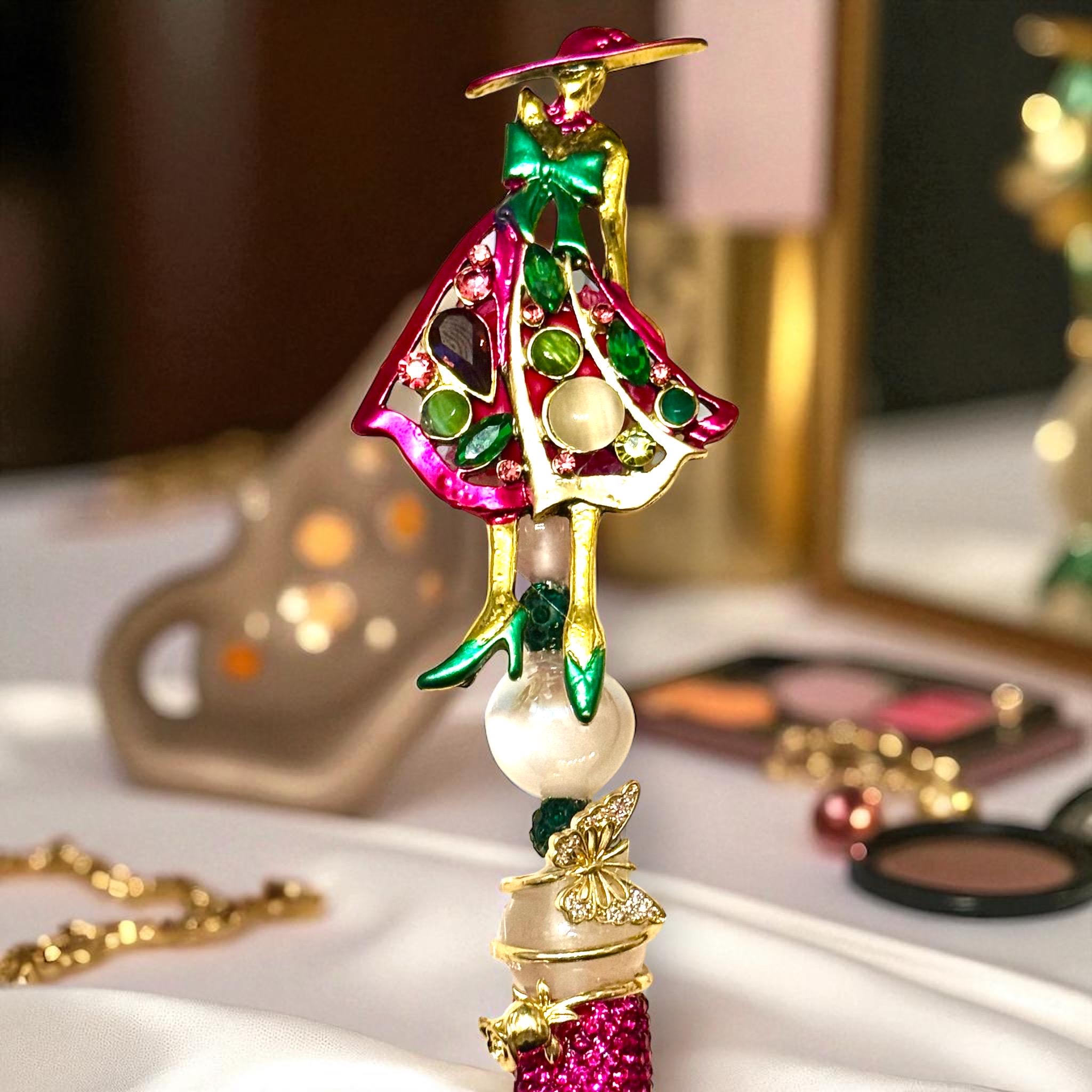 Glamorous Design: Adorned with vibrant rhinestones, it stands out and shines, just like you do. The lady figurine, dressed in a colorful skirt and stylish hat, adds a unique charm that speaks sophistication.