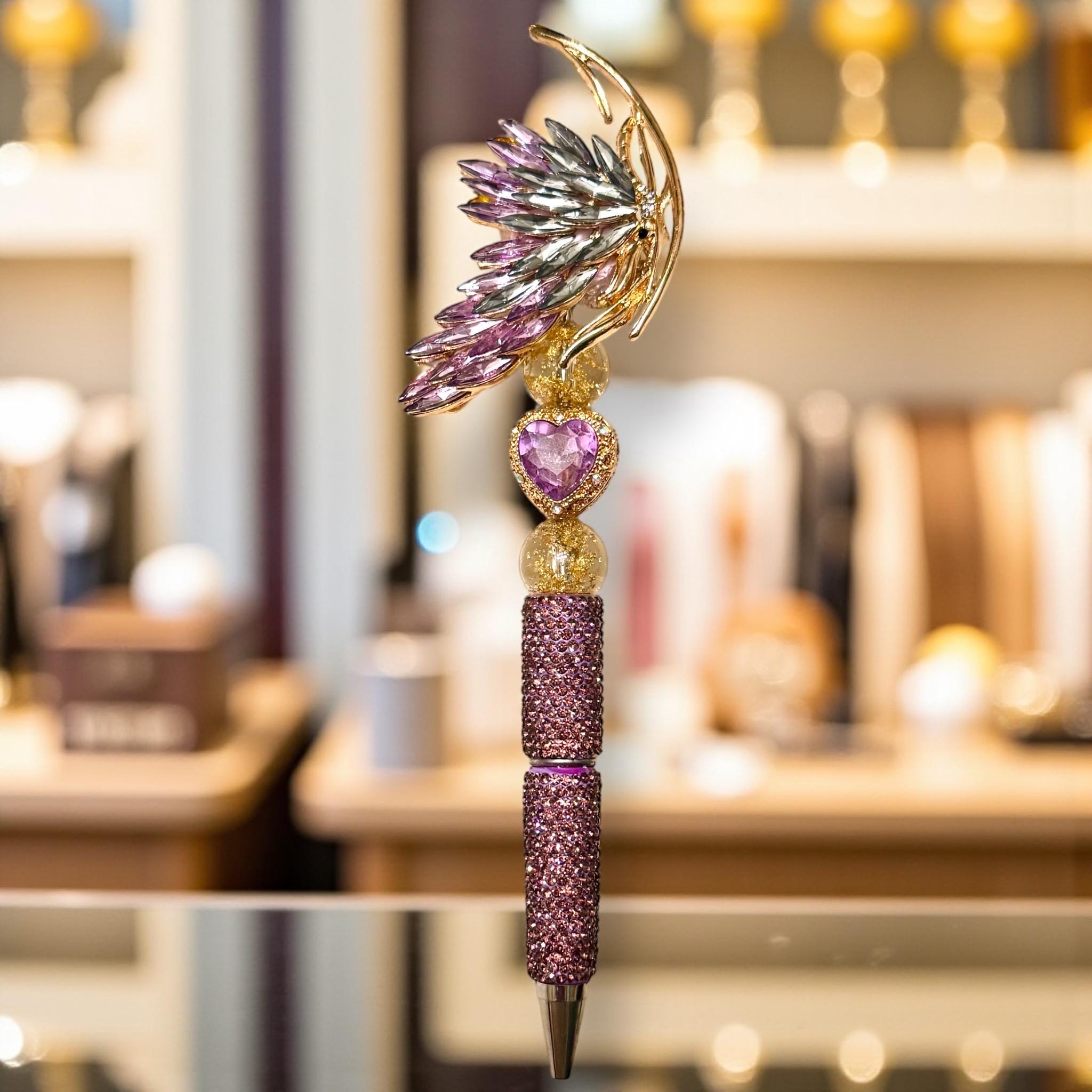 Elevate your writing experience with our exquisite Purple and Pewter Crystal Butterfly Rhinestone Pen—a striking masterpiece that merges functionality with luxurious artistry. Crafted with dazzling precision, this pen is adorned with shimmering rhinestones and a radiant butterfly design in purple and pewter hues. It's not just a writing instrument; it's a statement of elegance.