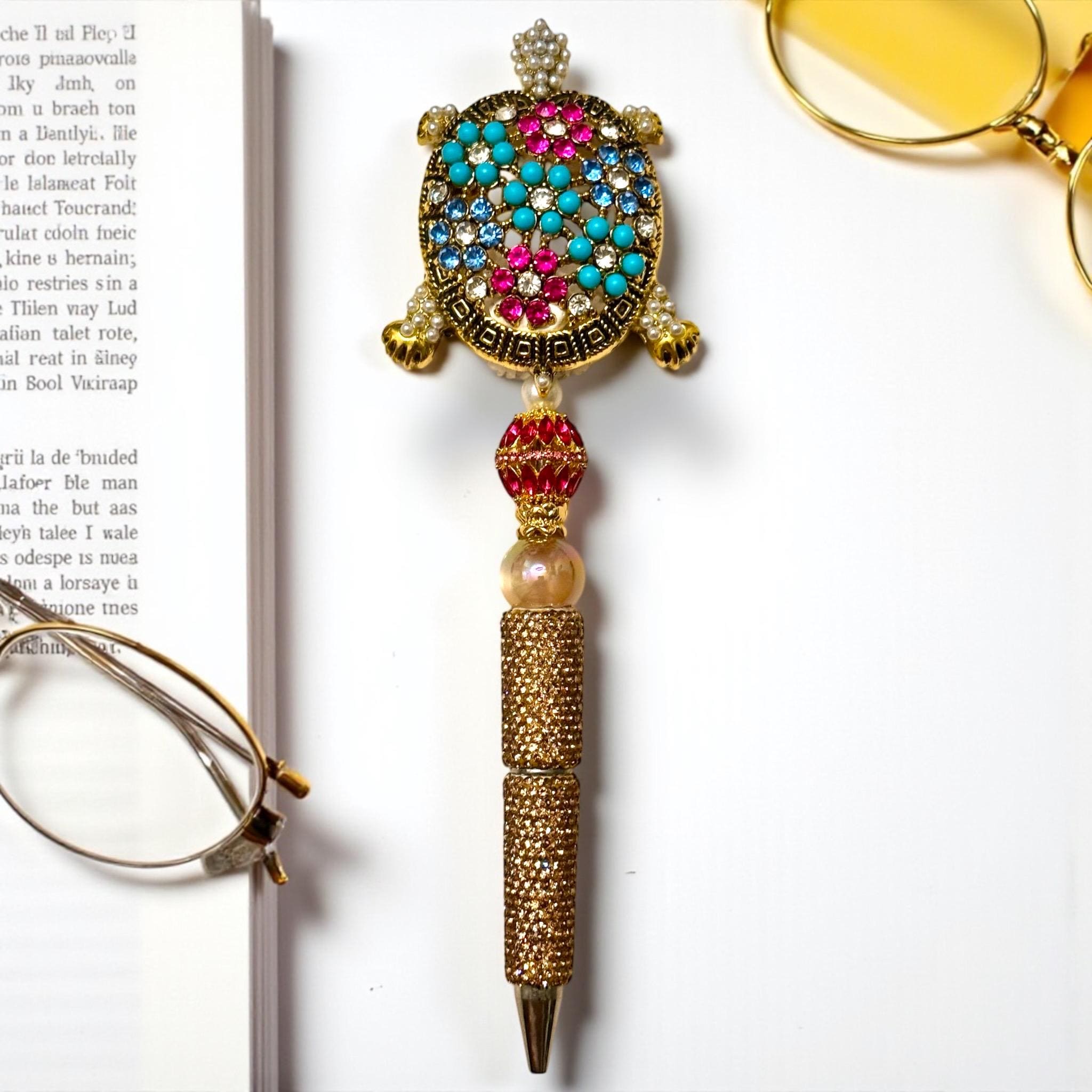 Mesmerizing Design: At the heart of its charm lies a beautifully crafted beaded turtle, adorned with shimmering rhinestones in vibrant hues like ocean blue, radiant red, and sparkling gold. This pen is not just a tool but a statement piece!