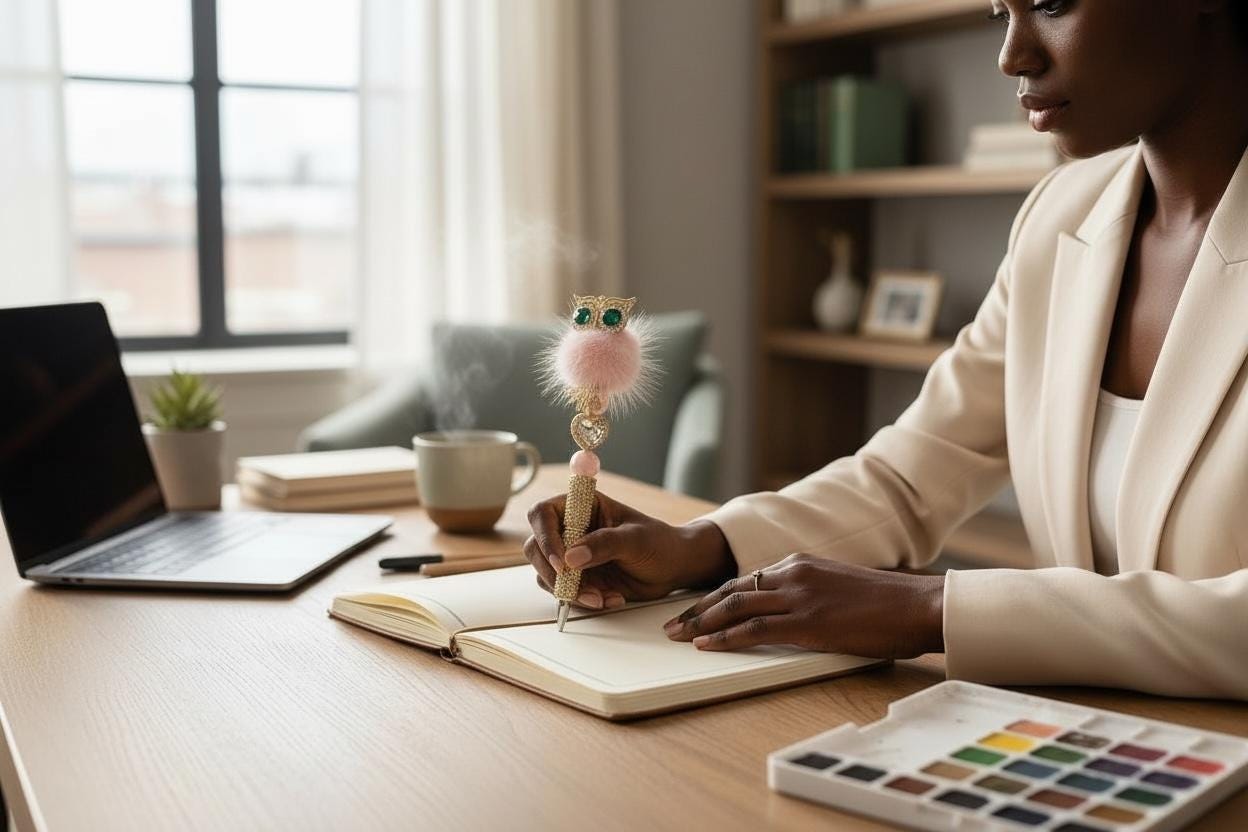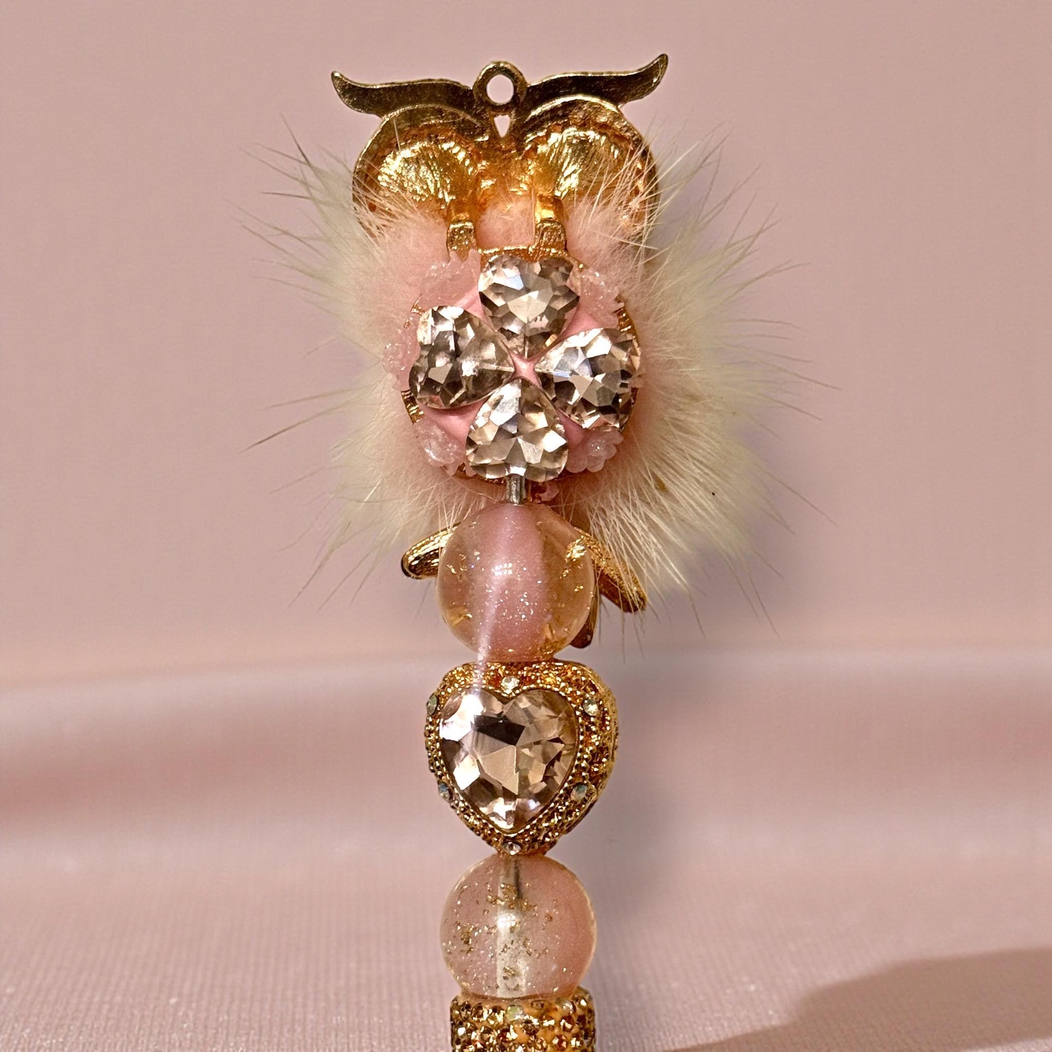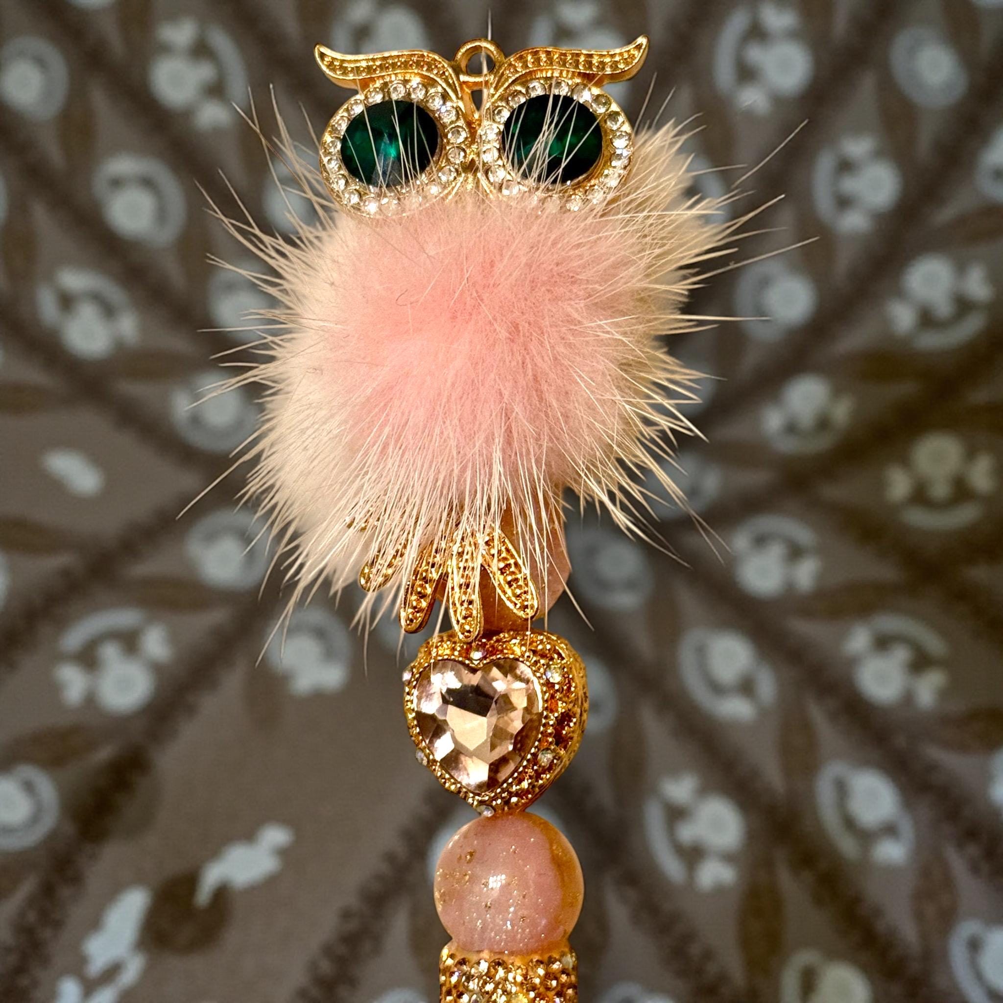 Elegant Design: A charming pink fluffy owl adorned with sparkling rhinestones stands atop the pen, turning it into a delightful centerpiece amidst your stationery collection.