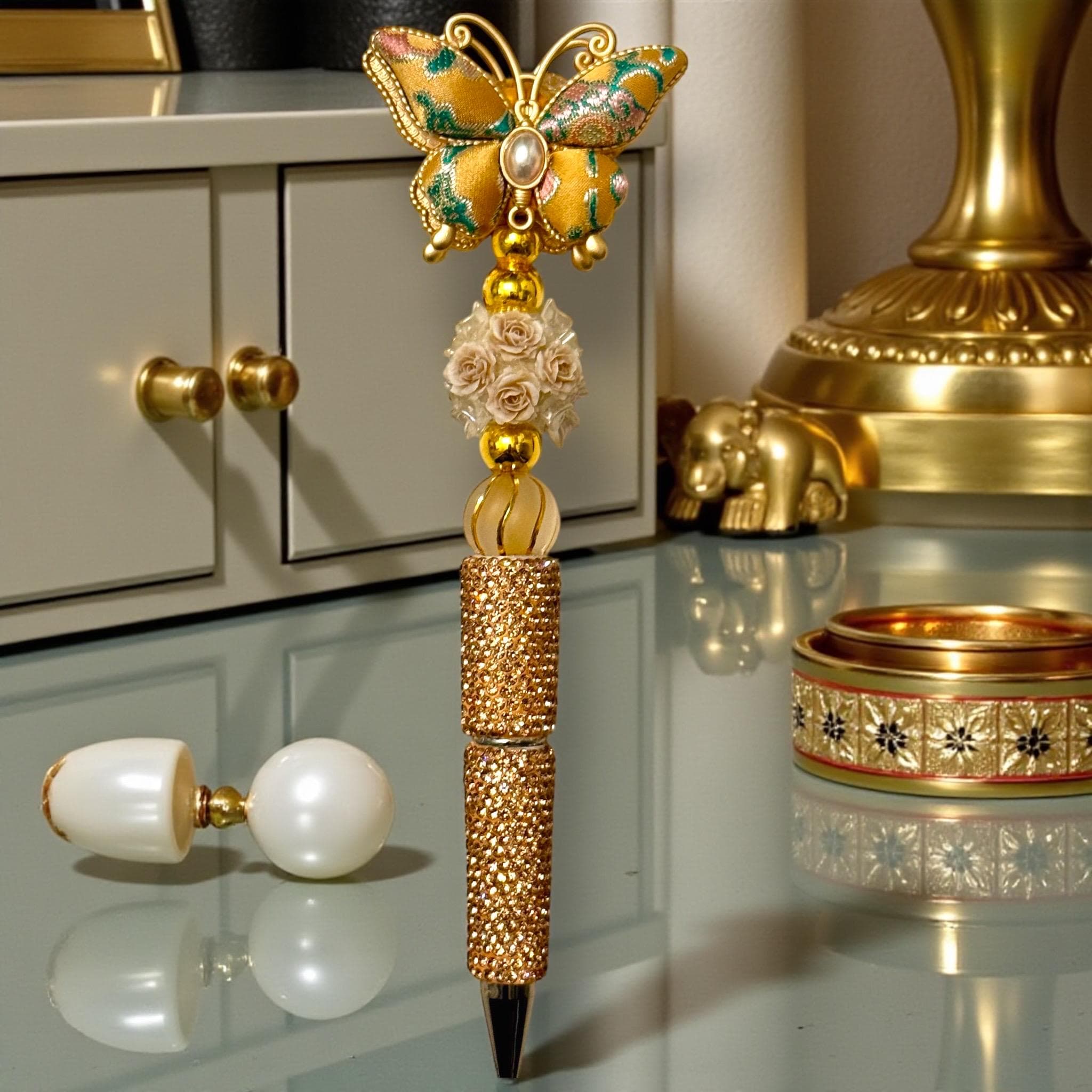 Introducing the Yellow Quilted Butterfly Rhinestone Pen—because ordinary pens are boring, and who wants boring? This fanciful writing instrument is not just a pen; it's your ticket to fabulousness. Imagine waltzing into the office and plopping this masterpiece onto the table—instant superstar status!