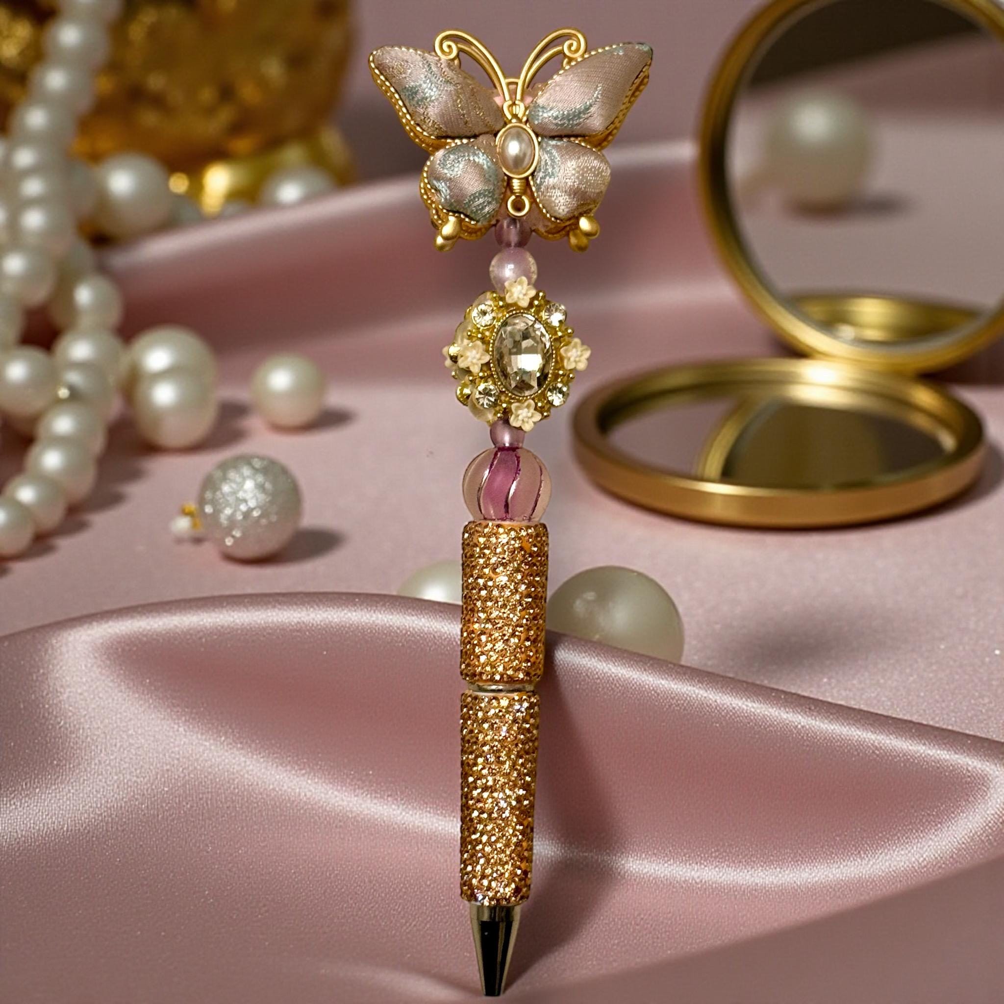 Exquisite Design: Adorned with a mesmerizing butterfly motif, quilted with delicate rhinestones, and set against a golden backdrop. This pen is a visual delight that attracts attention.