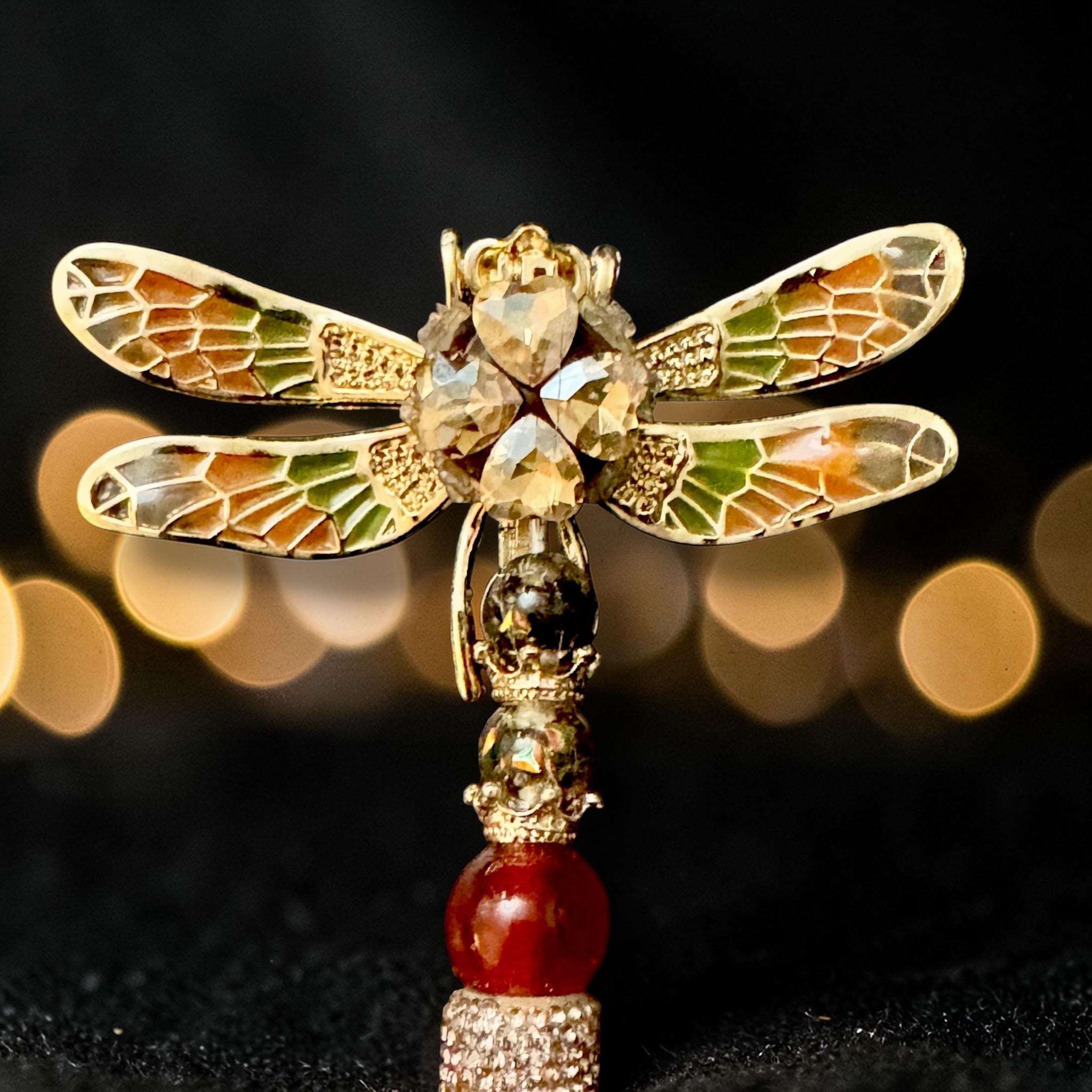 Stunning Design: Features a striking golden dragonfly adorned with shimmering rhinestones and vibrant enamel wings, exuding timeless charm.